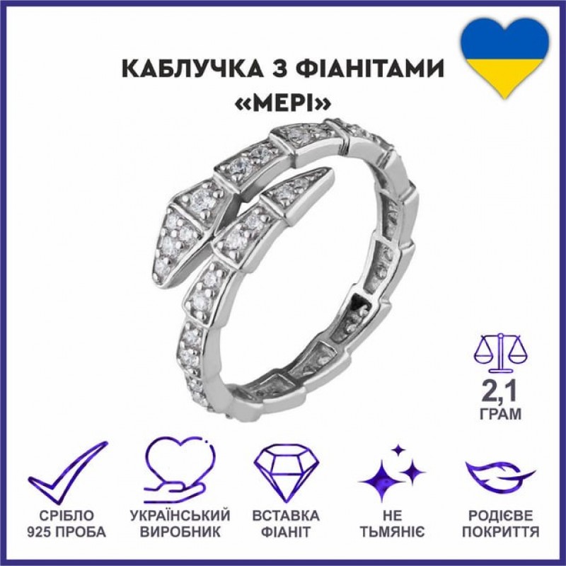 Каблучка срібна з фіанітами у формі змії: витонченість та стиль. Ця вишукана каблучка стане справжньою родзинкою вашого образу. Оригінальний дизайн у формі змії з сяючими фіанітами підкреслить вашу красу та витонченість.